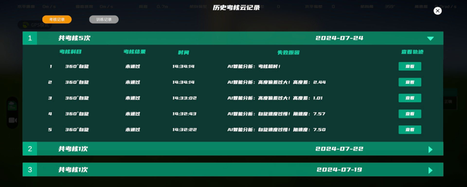 训练模式包含35个科目,可根据训练需求选择合适的科目进行训练,如定点对尾悬停、定点对头悬停、定点对左悬停、定点对右悬停、定点自旋360度、完整水平八字等。