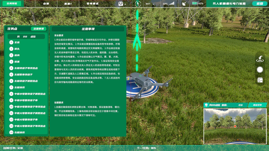该模块根据电力行业精细化巡检标准,通过使用无人机对高压电塔进行巡检部位拍摄,以在真机实践前进行虚拟仿真培训,减少炸机风险,避免飞行时的安全事故发生,该模块具有三种模式,即新手训练、训练模式、考核模式。