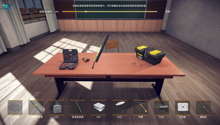 无人机虚拟仿真系统软件包含七大应用模块,包含无人机组装调试、无人机飞行训练、无人机投掷、无人机穿越障碍、无人机电力巡检、无人机灭火、无人机水域救援。