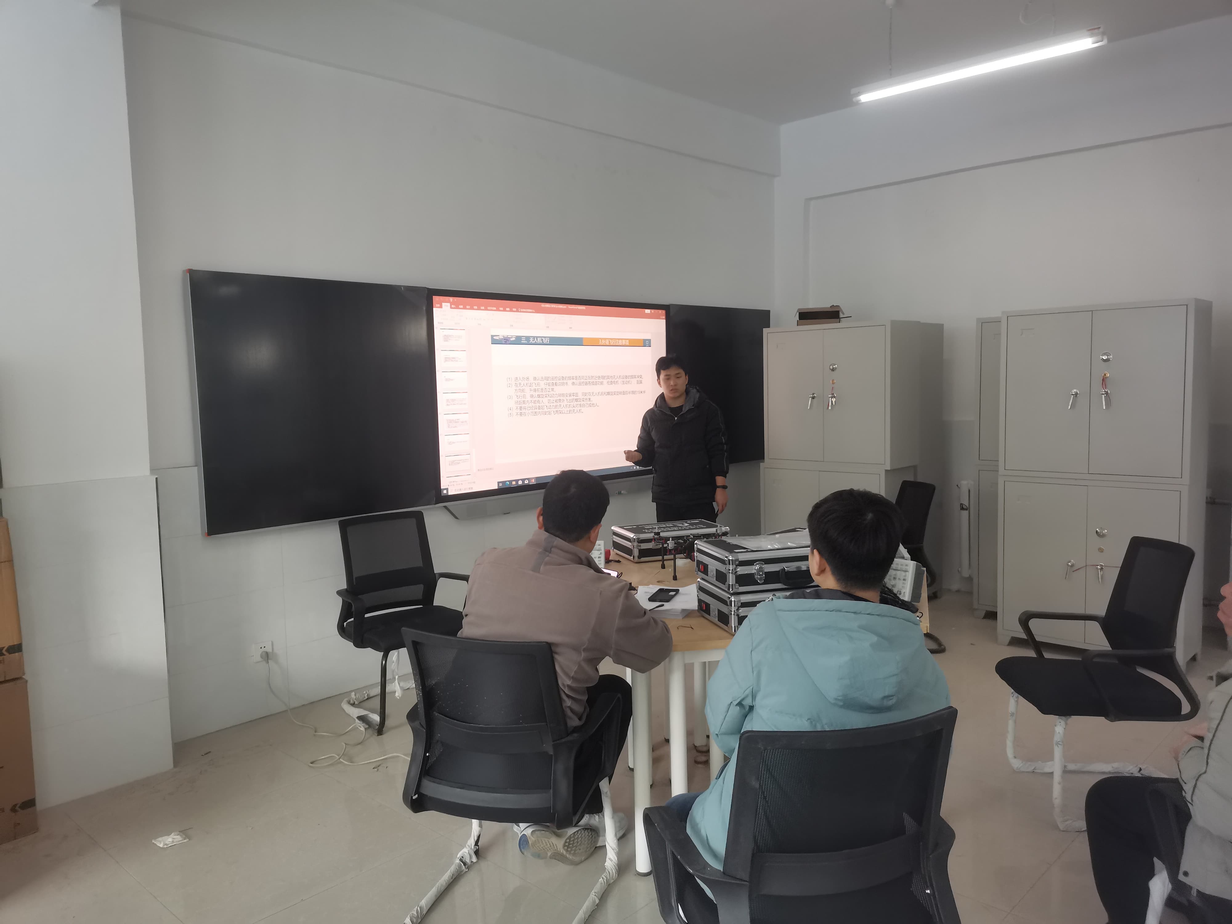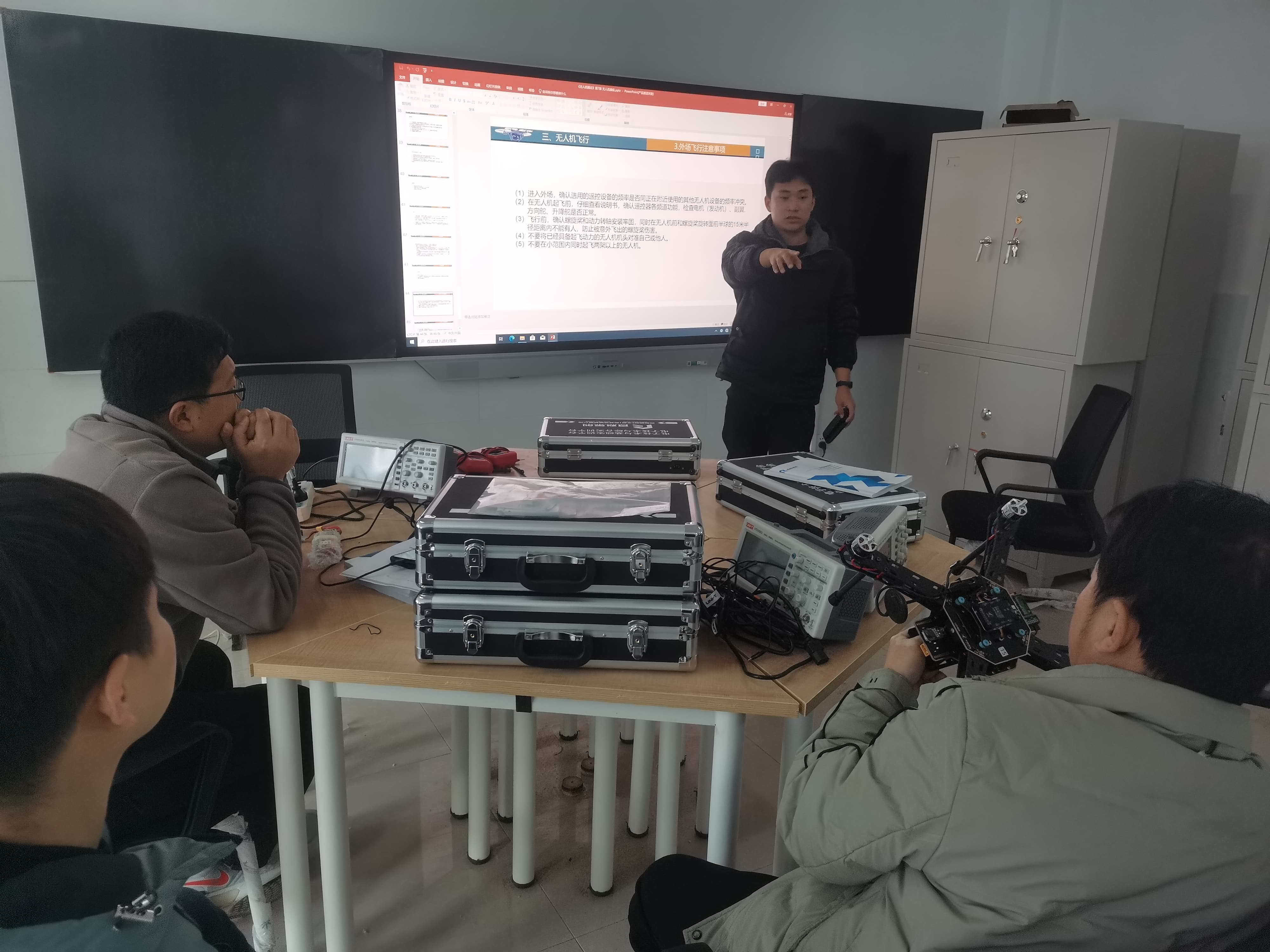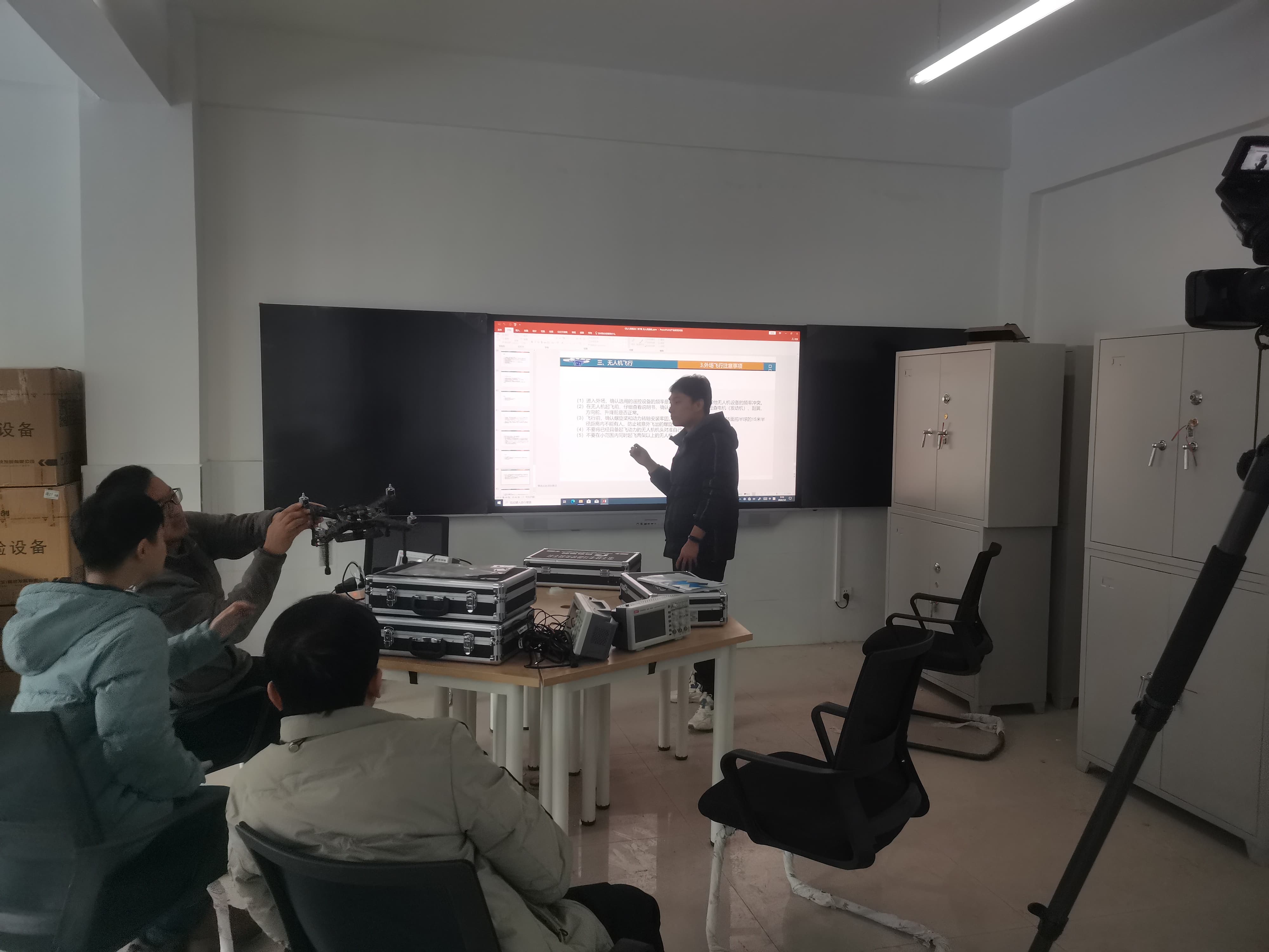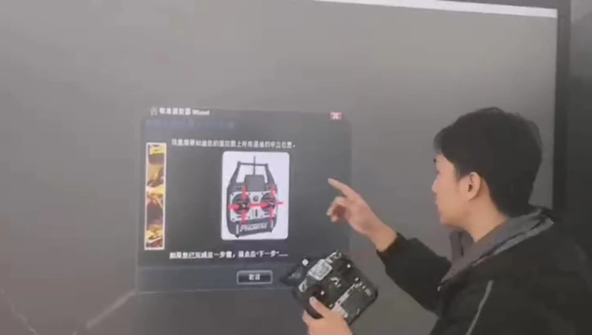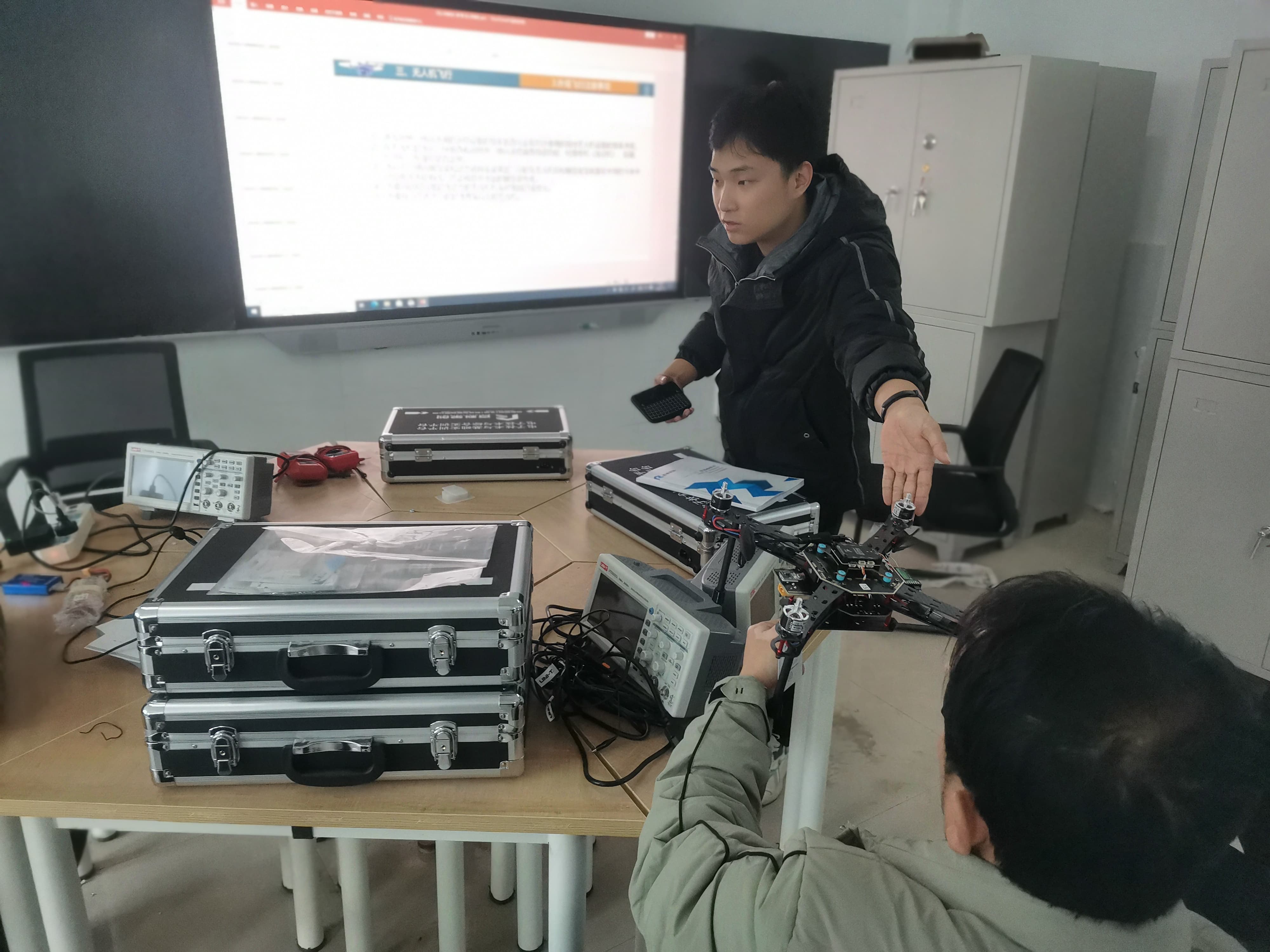 工程师在展示并讲解无人机遥控器