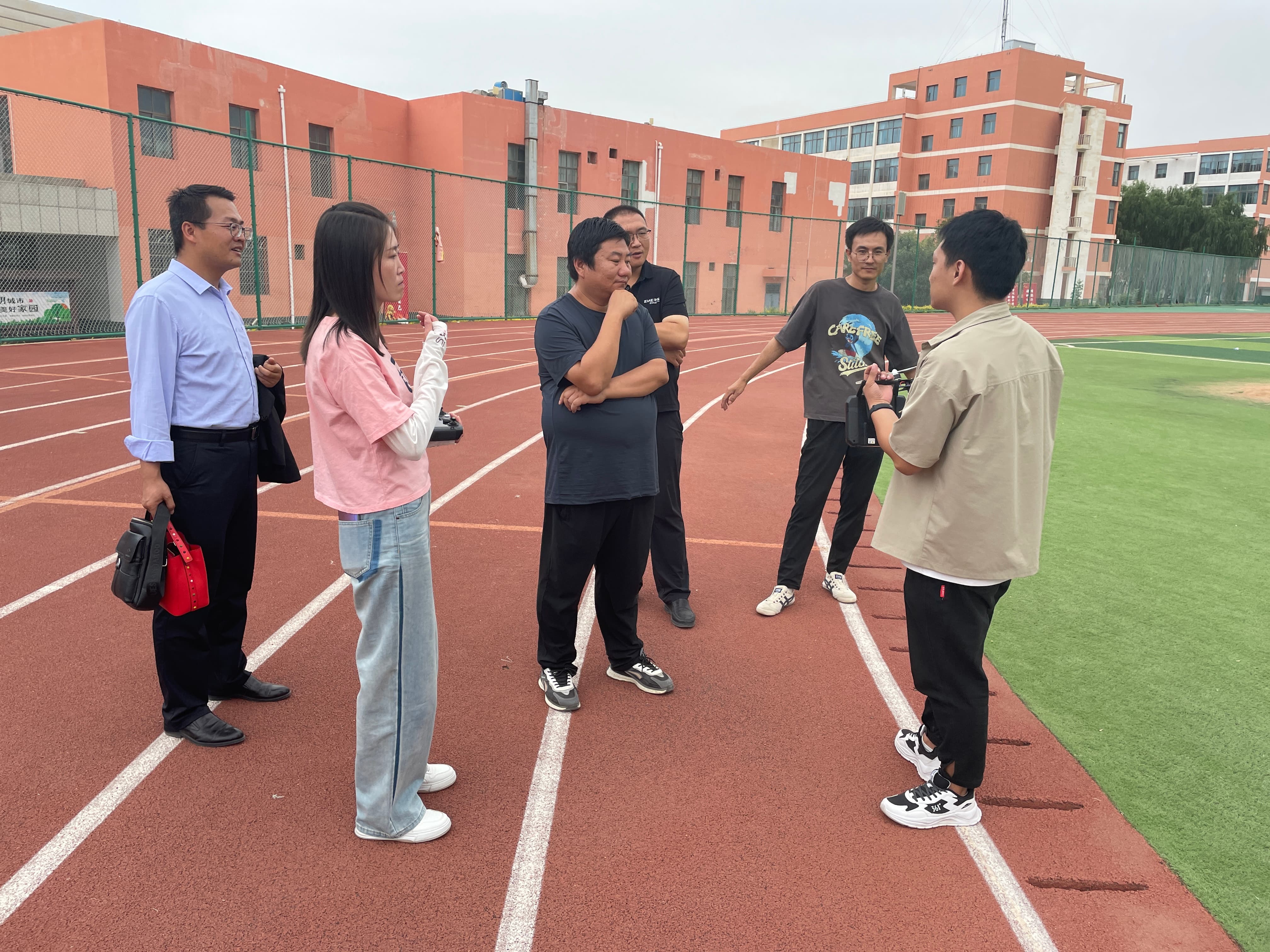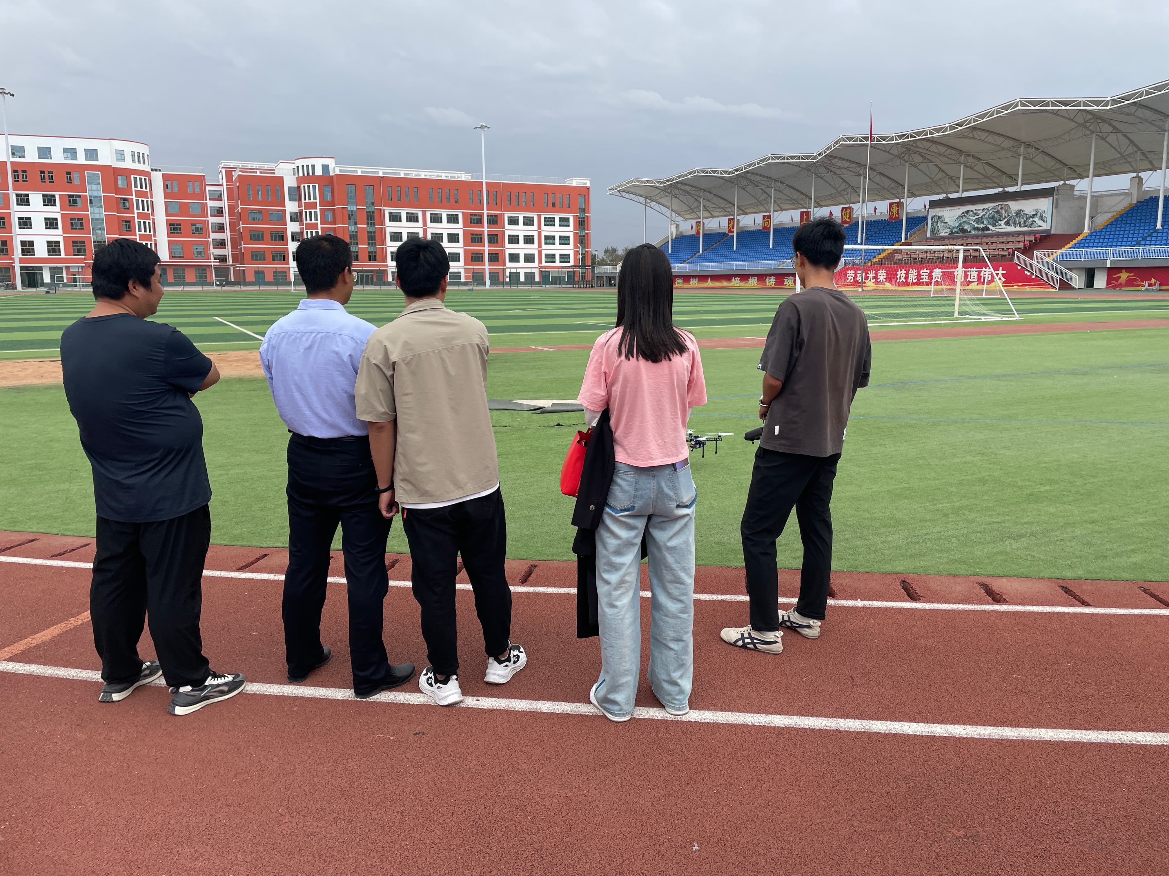 工程师在室外操场讲解无人机的飞行原理及遥控器的使用方法